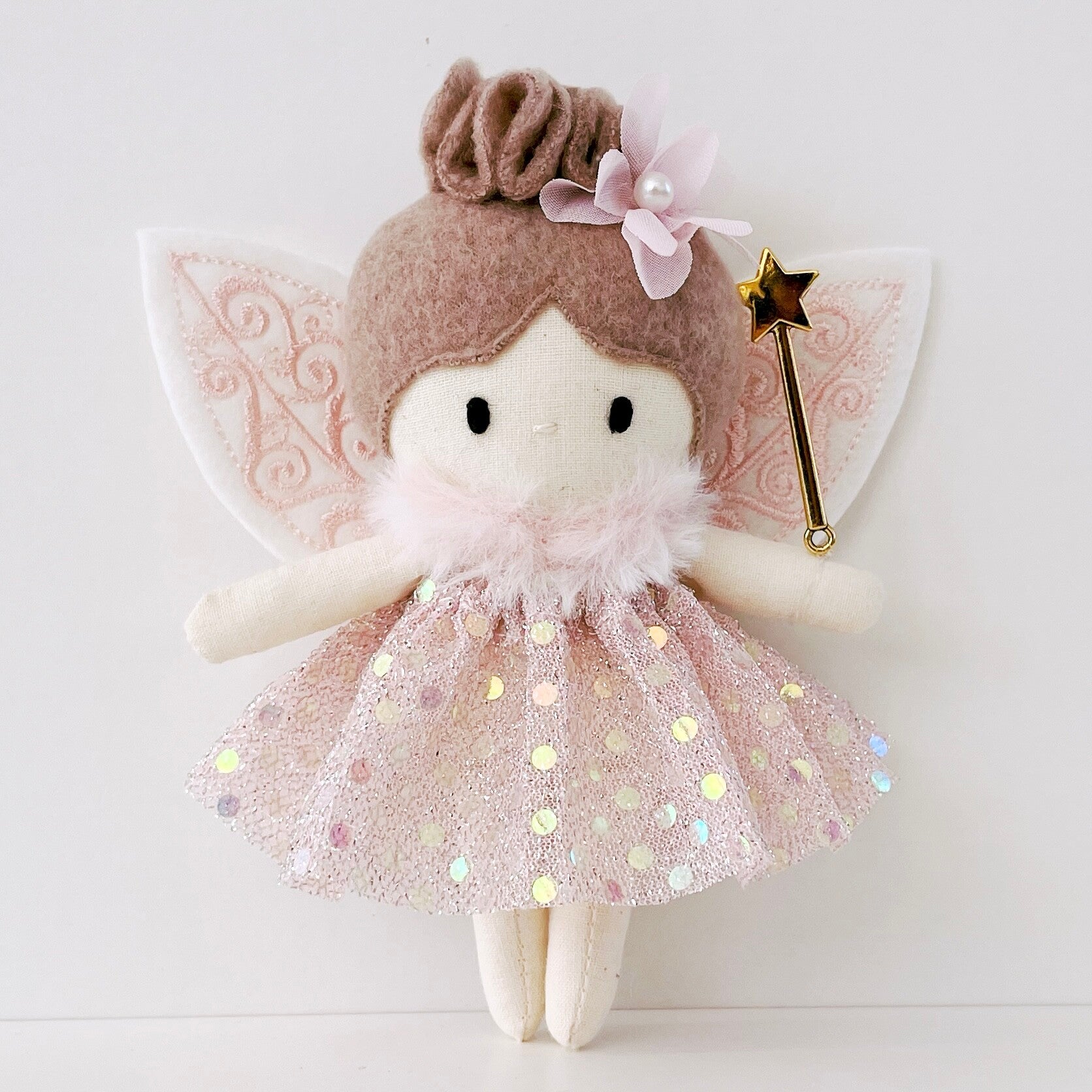 Dit lieve kleine feeënpopje is handgemaakt en ongeveer 12,5 cm groot. Met deze lengte is ze uitermate geschikt voor het poppenhuis. Dit lieve unieke feetje heeft geborduurde feeënvleugeltjes die ze om of af kan doen. Ook heeft ze een gouden toverstafje. Haar jurkje kan uit. Het sjaaltje is niet afneembaar.