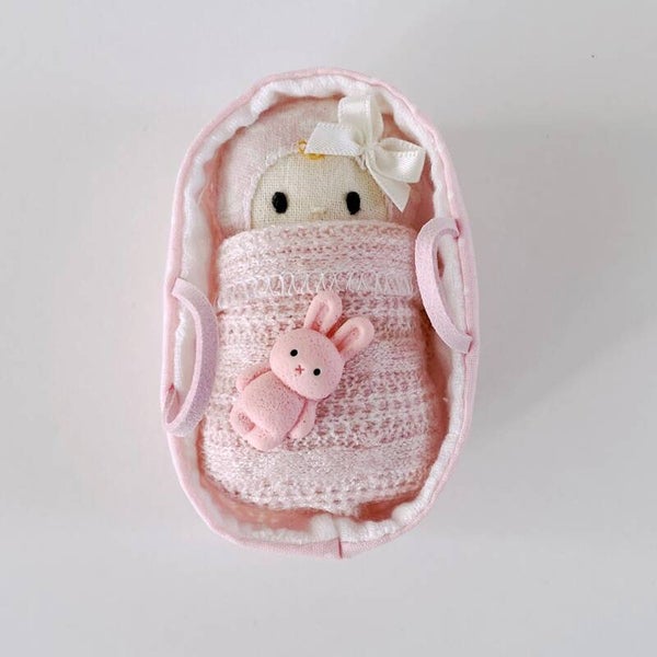 Het superzachte popje is 7cm klein en past precies in het lieve handgemaakte mandje. Het mandje is omkeerbaar.
