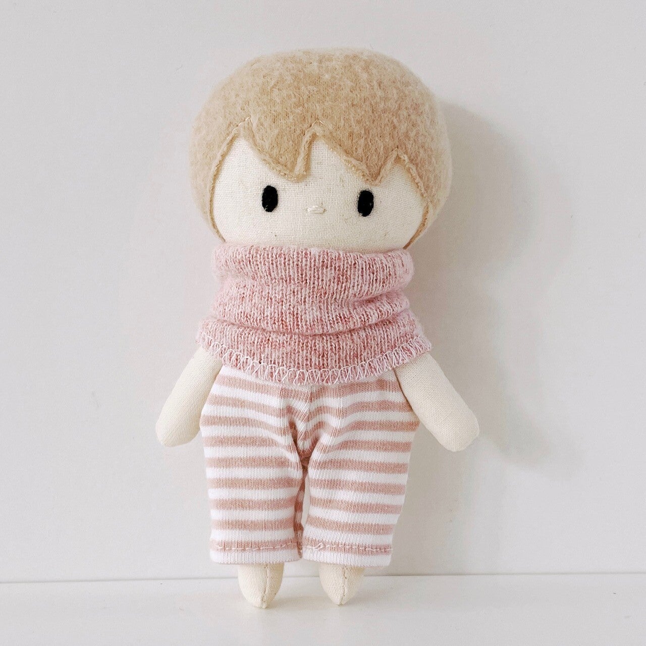 How cute can a doll be? This sweet little doll is handmade and about 5inch tall. With this length he fits perfectly in a dollhouse. Clothes can be changed.