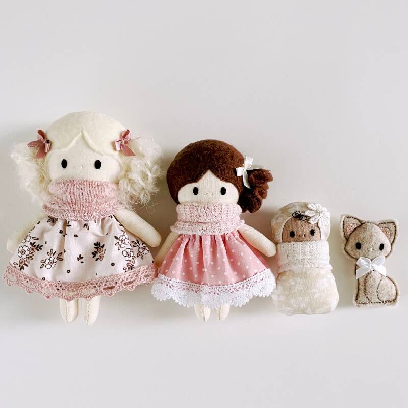 Dit lieve kleine popje is handgemaakt en ongeveer 10,5 cm groot. Zij is met dit formaat net iets kleiner dan het standaard popje van 12,5cm. Superlief!