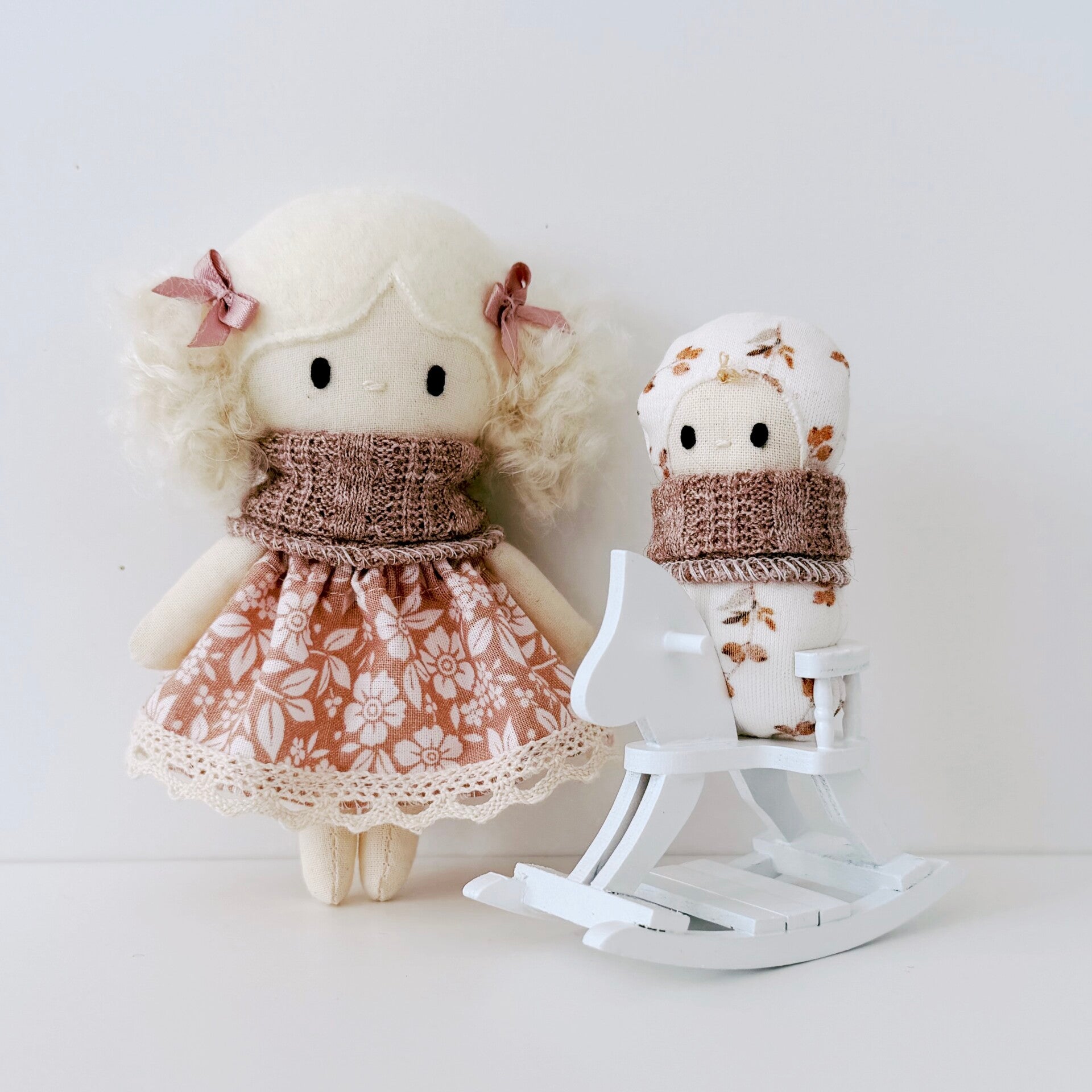 Het handgemaakte poppenhuispopje is 12,5 cm groot, het baby'tje is 7 cm groot.