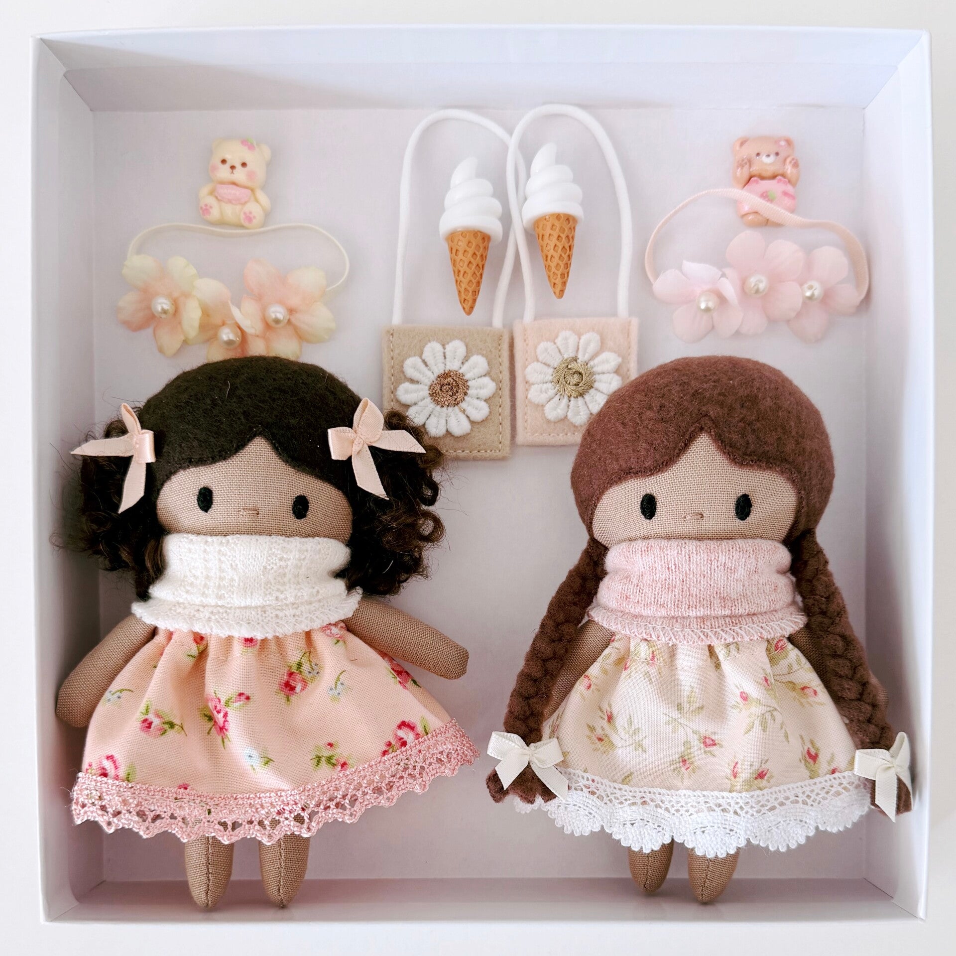 Het setje bestaat uit twee poppenhuis vriendinnetjes van 12,5 cm groot, 2 beertjes, een bloemenkransje voor beide popjes, ijsjes en 2 tasjes! En dit alles zit in een luxe geschenkverpakking!