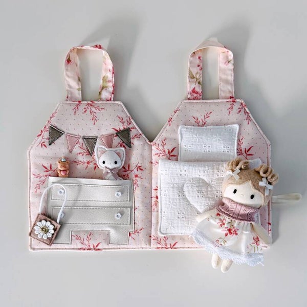 Hoe schattig is dit lieve draagtasje en huisje in één? Jouw Kleine Lievelijne popje van 12,5cm past er precies in! Het huisje kan worden opengemaakt dmv een knoopje en elastiek. Binnenin is het heel gezellig! Aan de linkerkant een kastje met daarin een bijpassend rokje, tasje en speelgoeddiertje. Aan de rechterkant een heerlijk bed waarin jouw popje lekker kan slapen. Een lief, zacht huisje om heerlijk mee te spelen. En ben je uitgespeeld? Dan vouw je het huisje weer dicht en aan de hengsels neem je het overal mee naartoe.