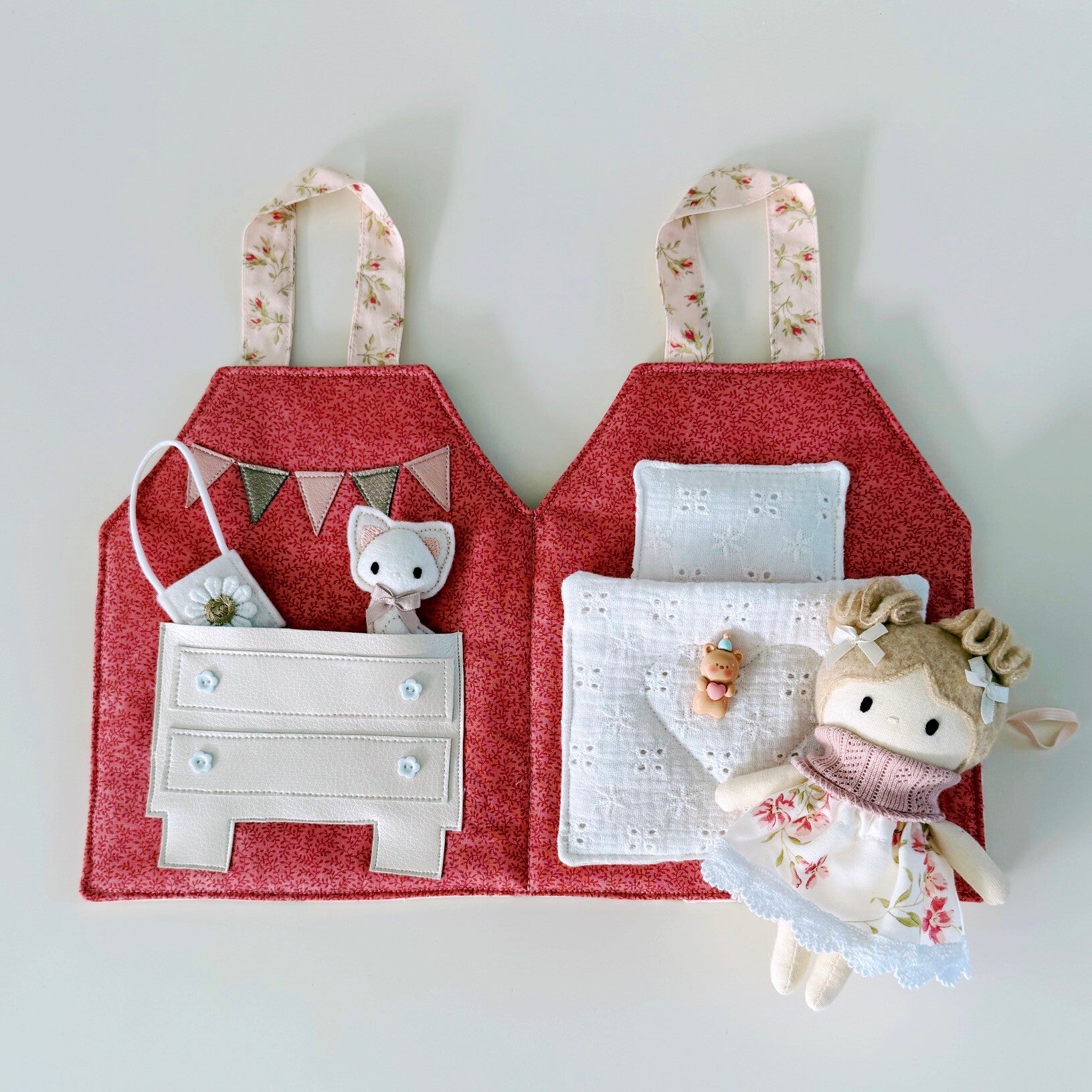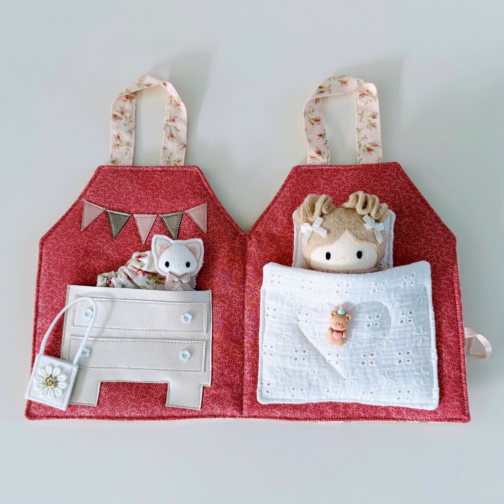 Hoe schattig is dit lieve draagtasje en huisje in één? Jouw Kleine Lievelijne popje van 12,5cm past er precies in! Het huisje kan worden opengemaakt dmv een knoopje en elastiek. Binnenin is het heel gezellig! Aan de linkerkant een kastje met daarin een bijpassend rokje, tasje en speelgoeddiertje. Aan de rechterkant een heerlijk bed waarin jouw popje lekker kan slapen. Een lief, zacht huisje om heerlijk mee te spelen. En ben je uitgespeeld? Dan vouw je het huisje weer dicht en aan de hengsels neem je het overal mee naartoe.