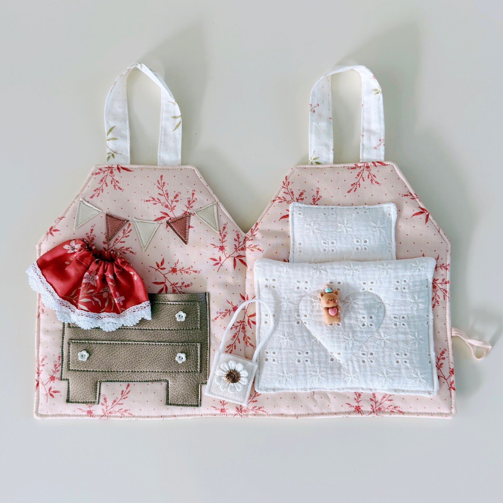 Hoe schattig is dit lieve draagtasje en huisje in één? Jouw Kleine Lievelijne popje van 12,5cm past er precies in! Het huisje kan worden opengemaakt dmv een knoopje en elastiek. Binnenin is het heel gezellig! Aan de linkerkant een kastje met daarin een bijpassend rokje, tasje en speelgoeddiertje. Aan de rechterkant een heerlijk bed waarin jouw popje lekker kan slapen. Een lief, zacht huisje om heerlijk mee te spelen. En ben je uitgespeeld? Dan vouw je het huisje weer dicht en aan de hengsels neem je het overal mee naartoe.