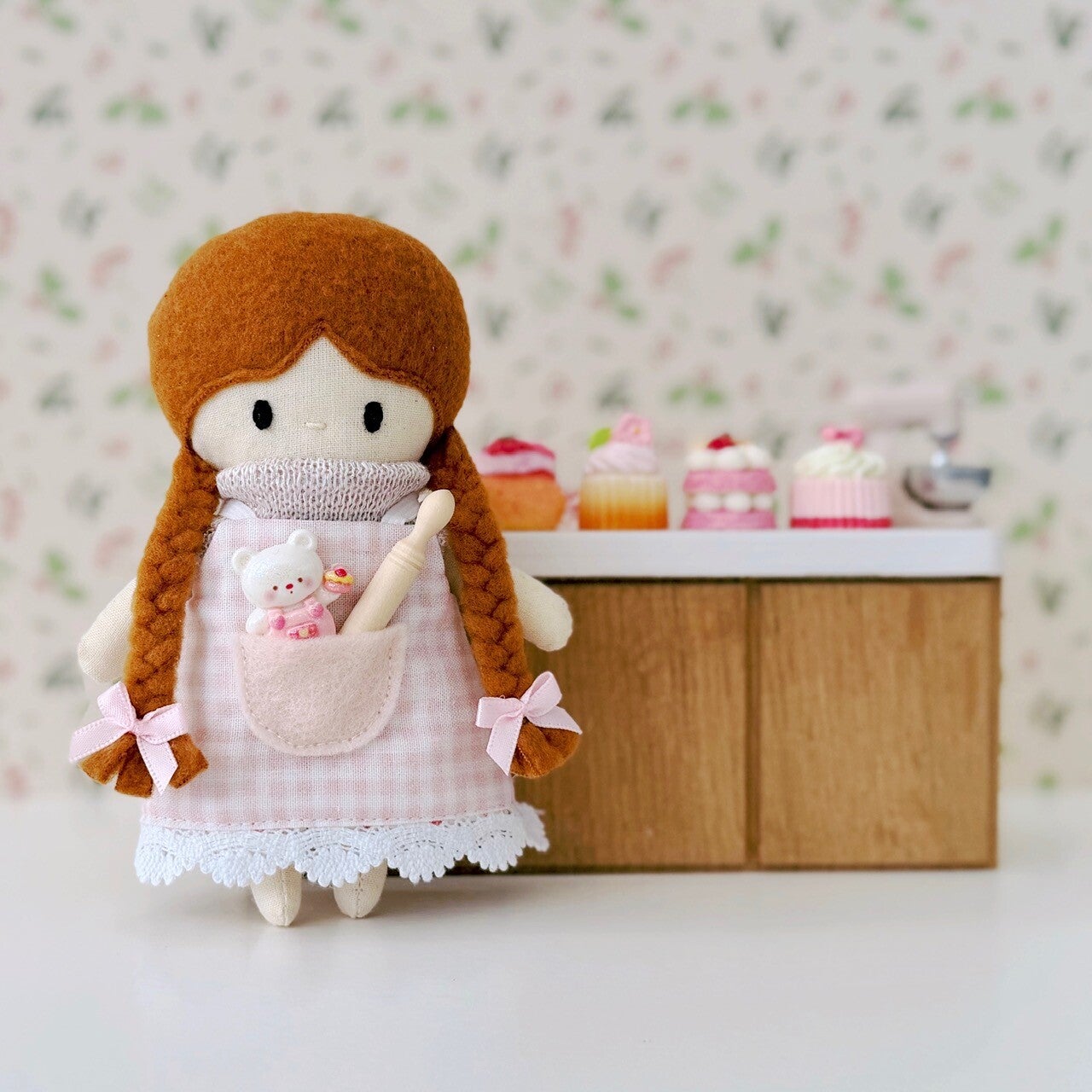 Lief kledingsetje voor de poppenhuis popjes van Kleine Lievelijne. Zo kan jouw lieve popje wisselen met haar kleertjes en iedere dag iets anders moois aantrekken. Het setje bestaat uit een keukenschort die aan twee zijden te dragen is, 3 gebakjes, een deegroller en speelgoedbeertje.