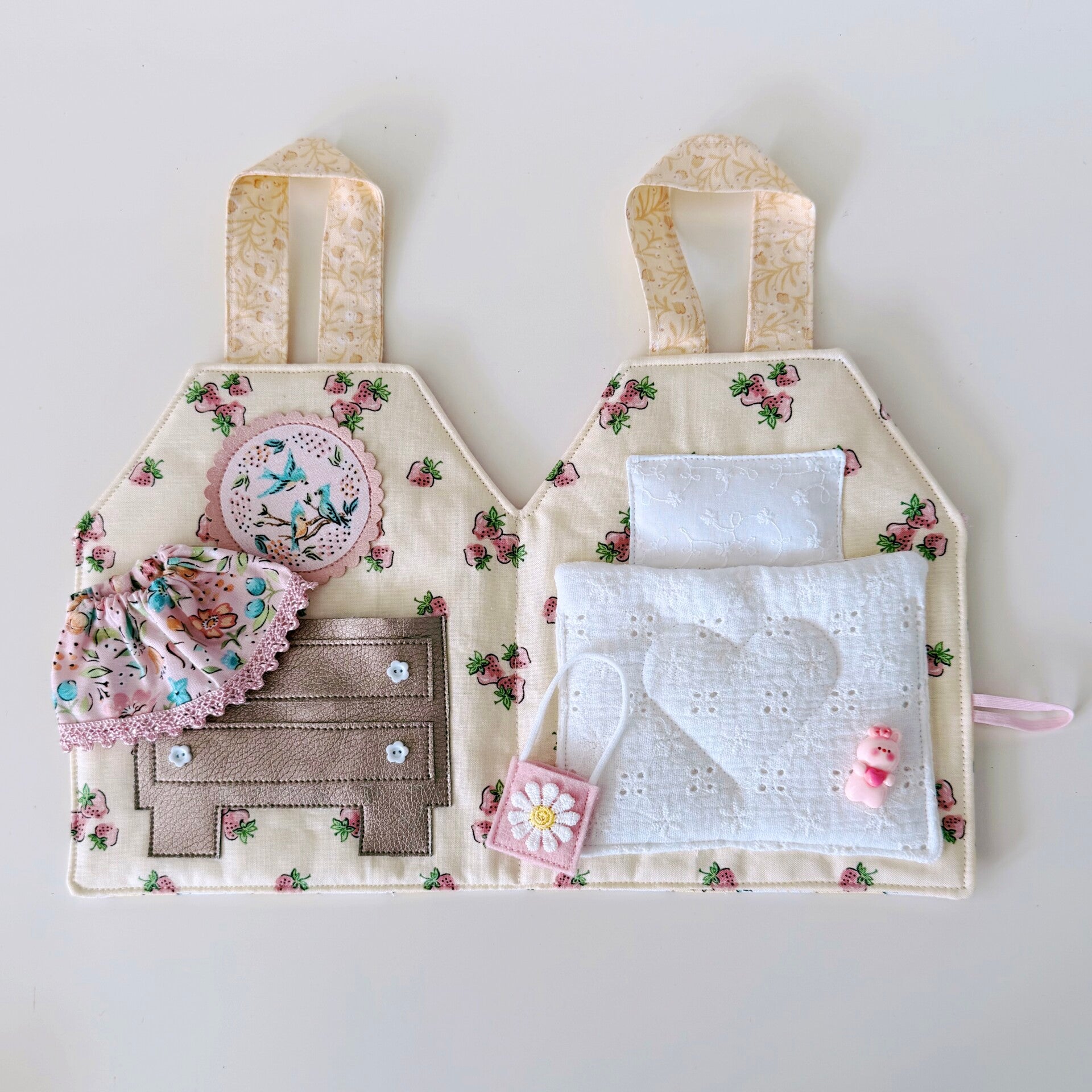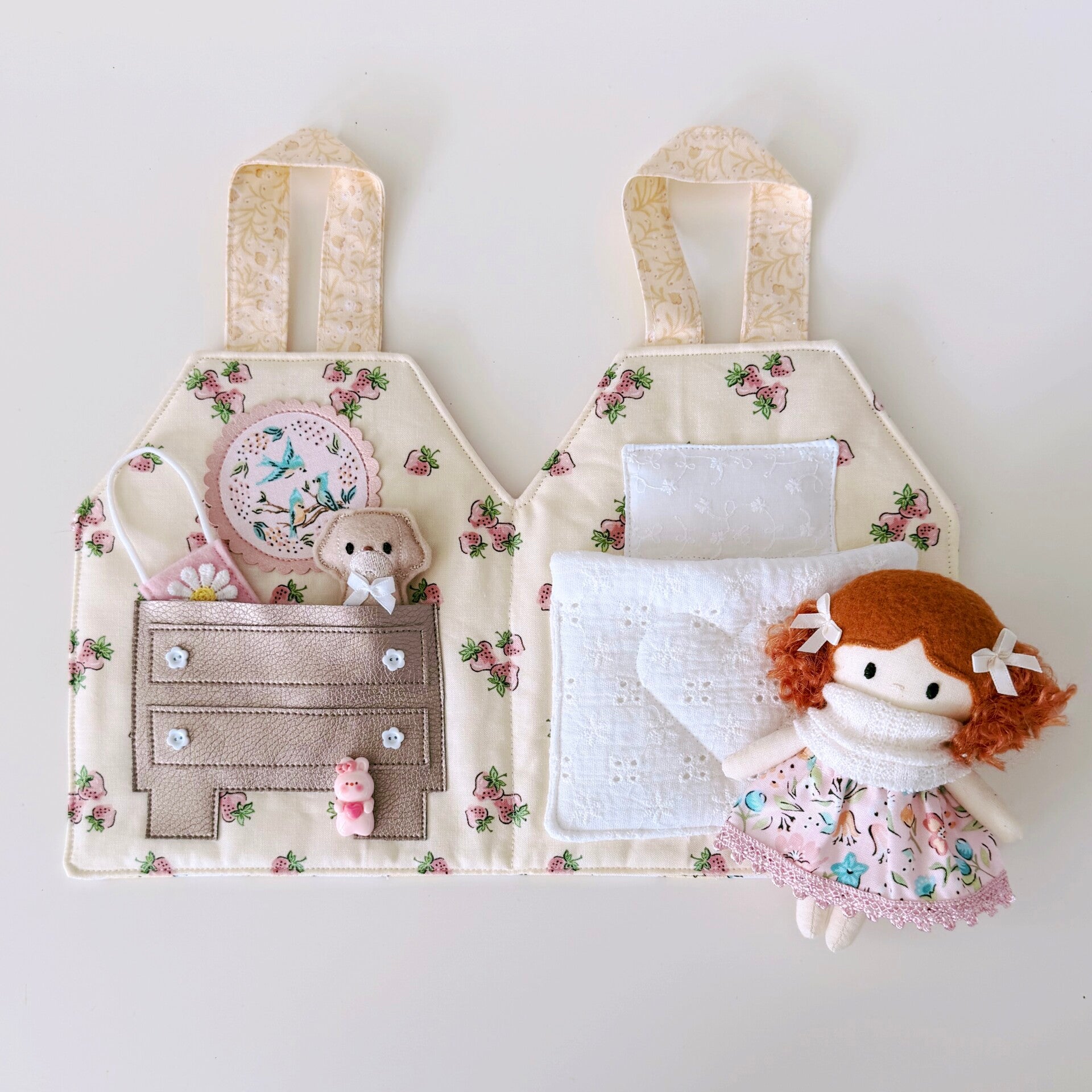 Hoe schattig is dit lieve draagtasje en huisje in één? Jouw Kleine Lievelijne popje van 12,5cm past er precies in! Het huisje kan worden opengemaakt dmv een knoopje en elastiek. Binnenin is het heel gezellig! Aan de linkerkant een kastje met daarin een bijpassend rokje, tasje en speelgoeddiertje. Aan de rechterkant een heerlijk bed waarin jouw popje lekker kan slapen. Een lief, zacht huisje om heerlijk mee te spelen. En ben je uitgespeeld? Dan vouw je het huisje weer dicht en aan de hengsels neem je het overal mee naartoe.