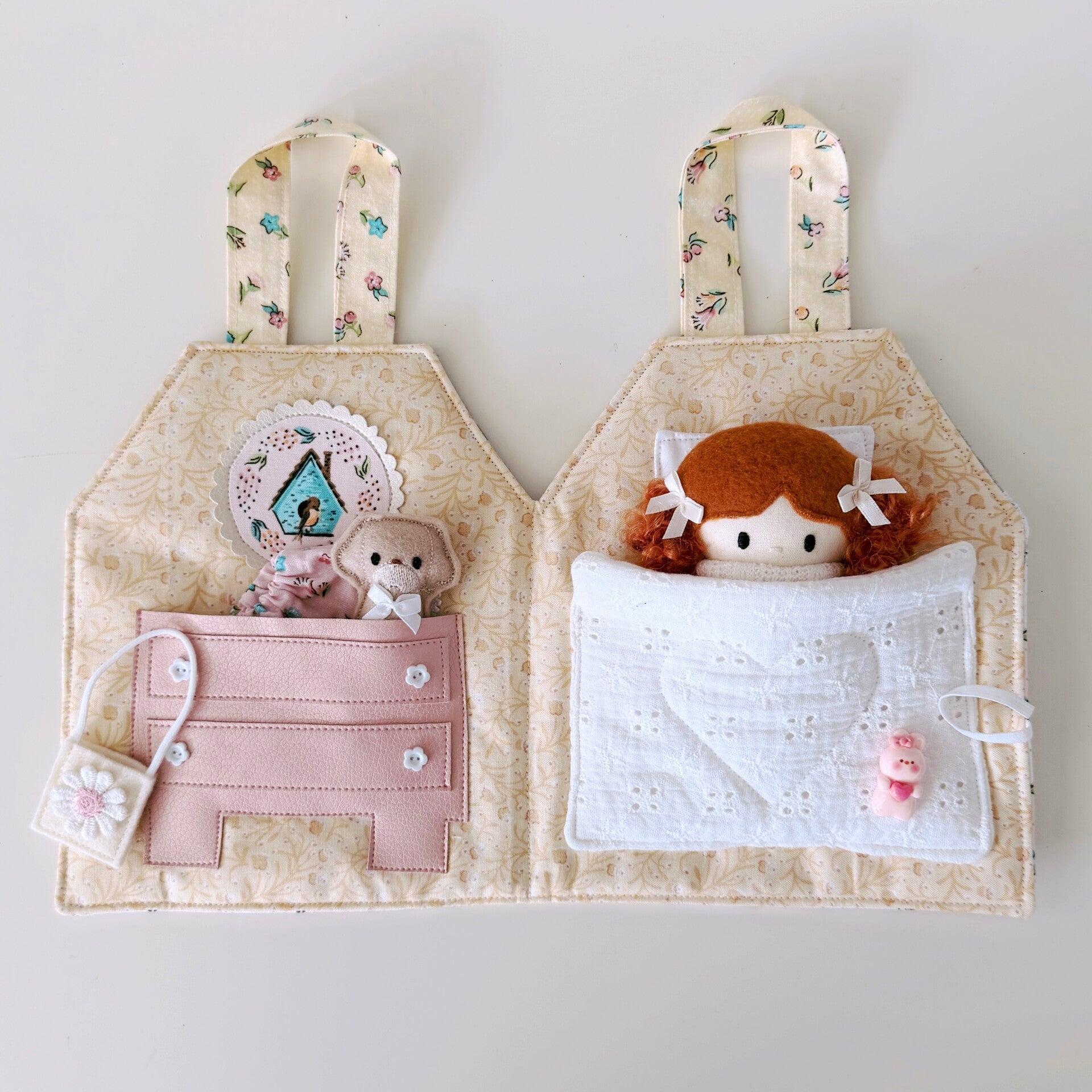 Hoe schattig is dit lieve draagtasje en huisje in één? Jouw Kleine Lievelijne popje van 12,5cm past er precies in! Het huisje kan worden opengemaakt dmv een knoopje en elastiek. Binnenin is het heel gezellig! Aan de linkerkant een kastje met daarin een bijpassend rokje, tasje en speelgoeddiertje. Aan de rechterkant een heerlijk bed waarin jouw popje lekker kan slapen. Een lief, zacht huisje om heerlijk mee te spelen. En ben je uitgespeeld? Dan vouw je het huisje weer dicht en aan de hengsels neem je het overal mee naartoe.