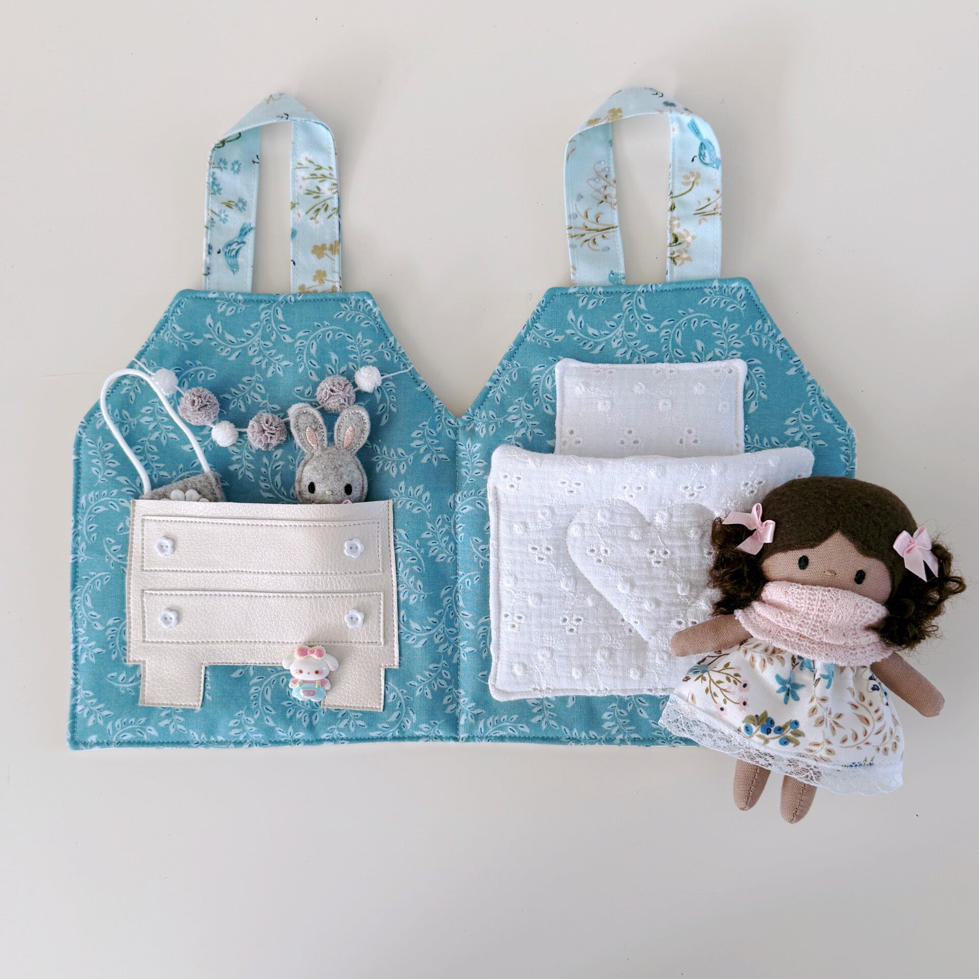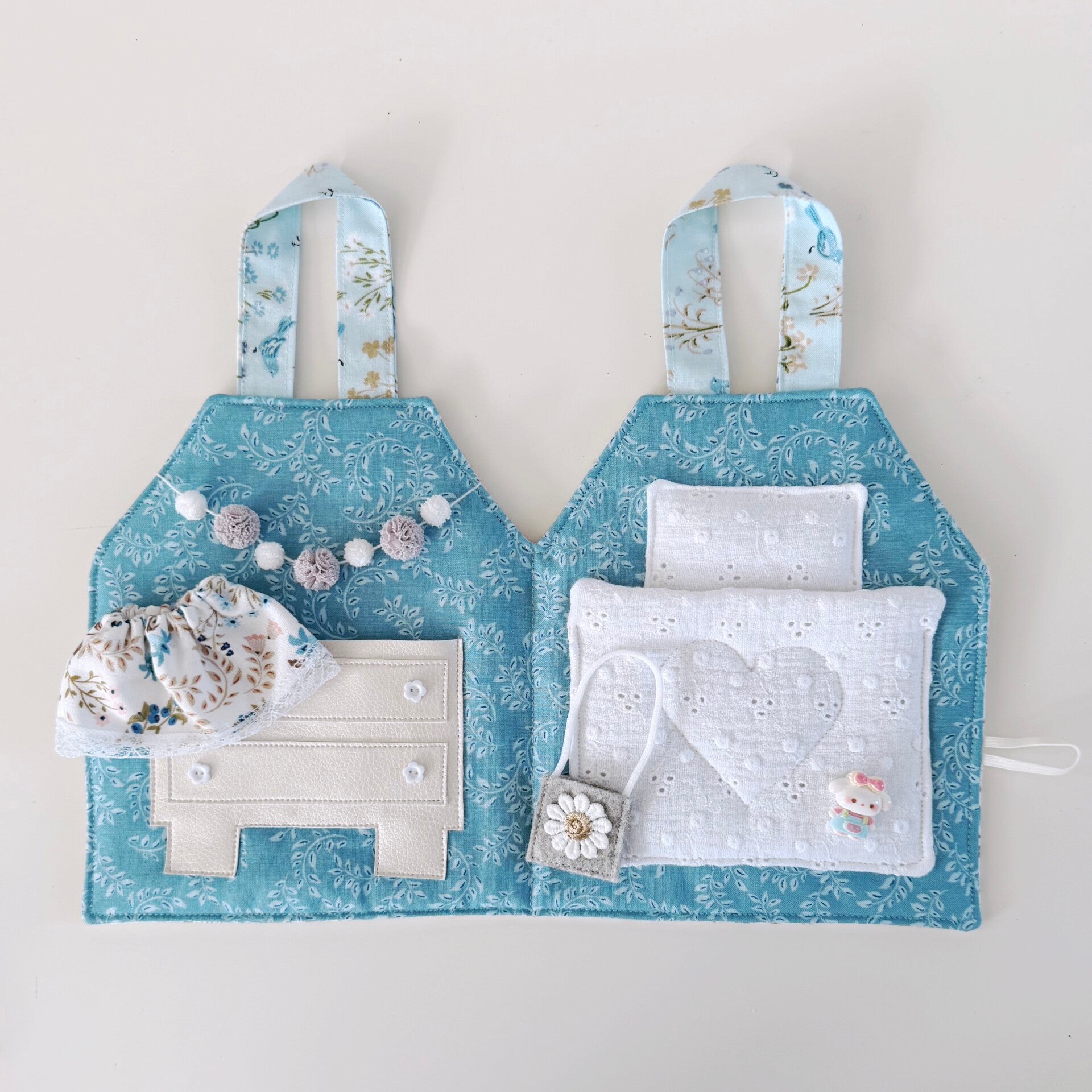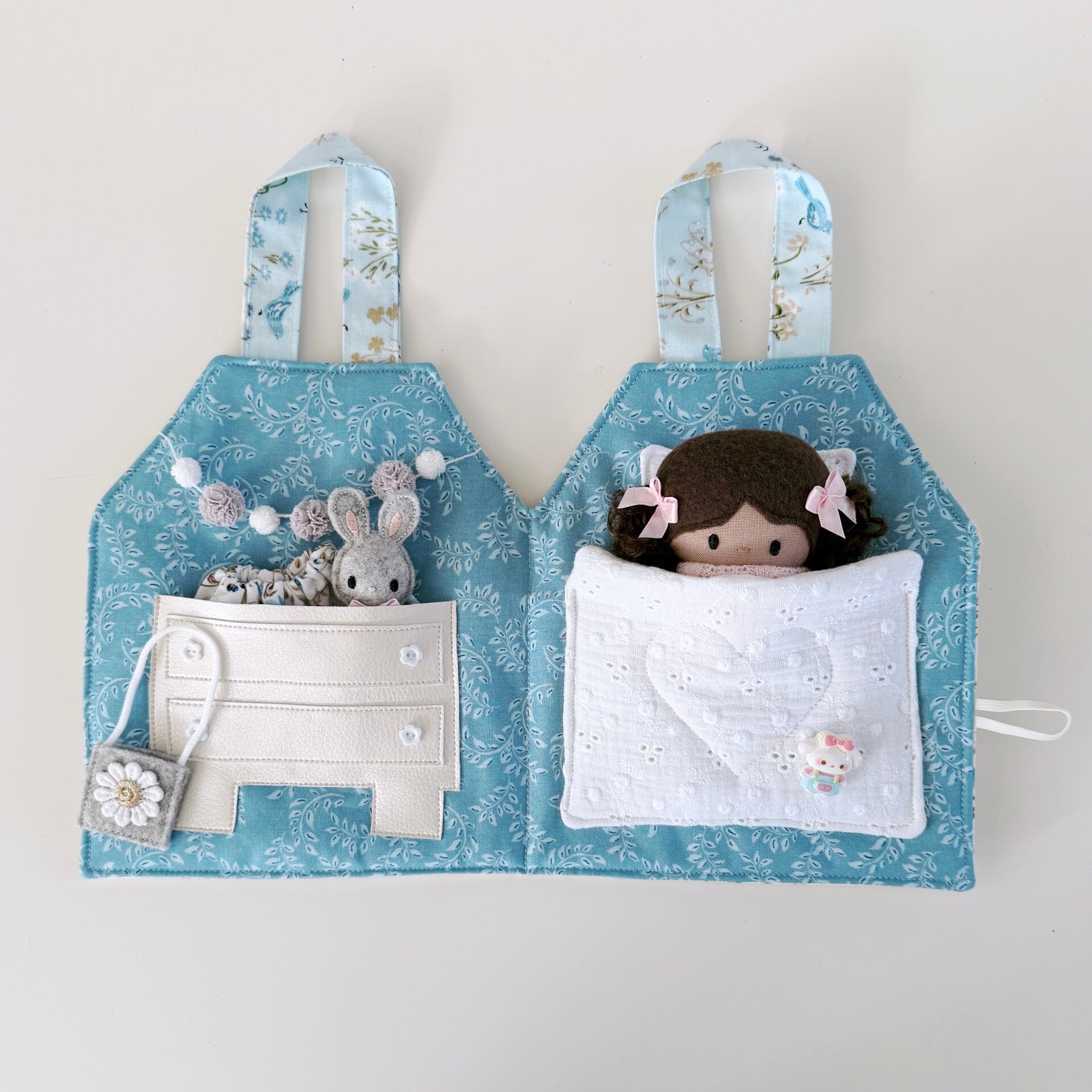 Hoe schattig is dit lieve draagtasje en huisje in één? Jouw Kleine Lievelijne popje van 12,5cm past er precies in! Het huisje kan worden opengemaakt dmv een knoopje en elastiek. Binnenin is het heel gezellig! Aan de linkerkant een kastje met daarin een bijpassend rokje, tasje en speelgoeddiertje. Aan de rechterkant een heerlijk bed waarin jouw popje lekker kan slapen. Een lief, zacht huisje om heerlijk mee te spelen. En ben je uitgespeeld? Dan vouw je het huisje weer dicht en aan de hengsels neem je het overal mee naartoe.