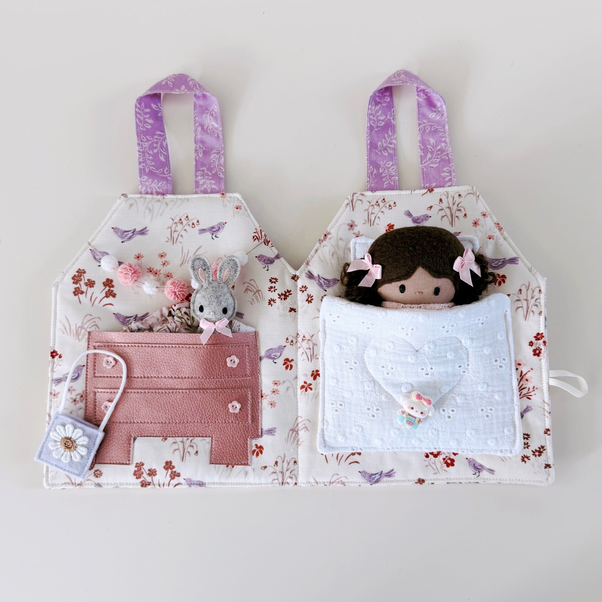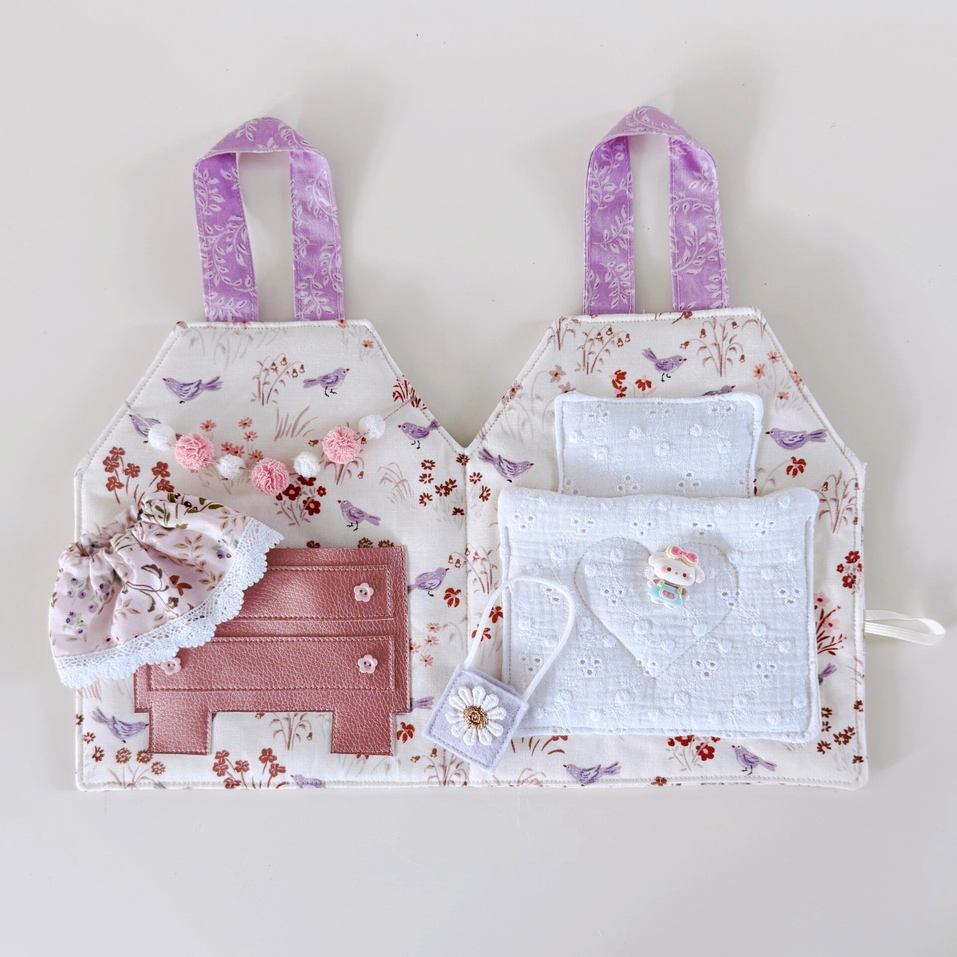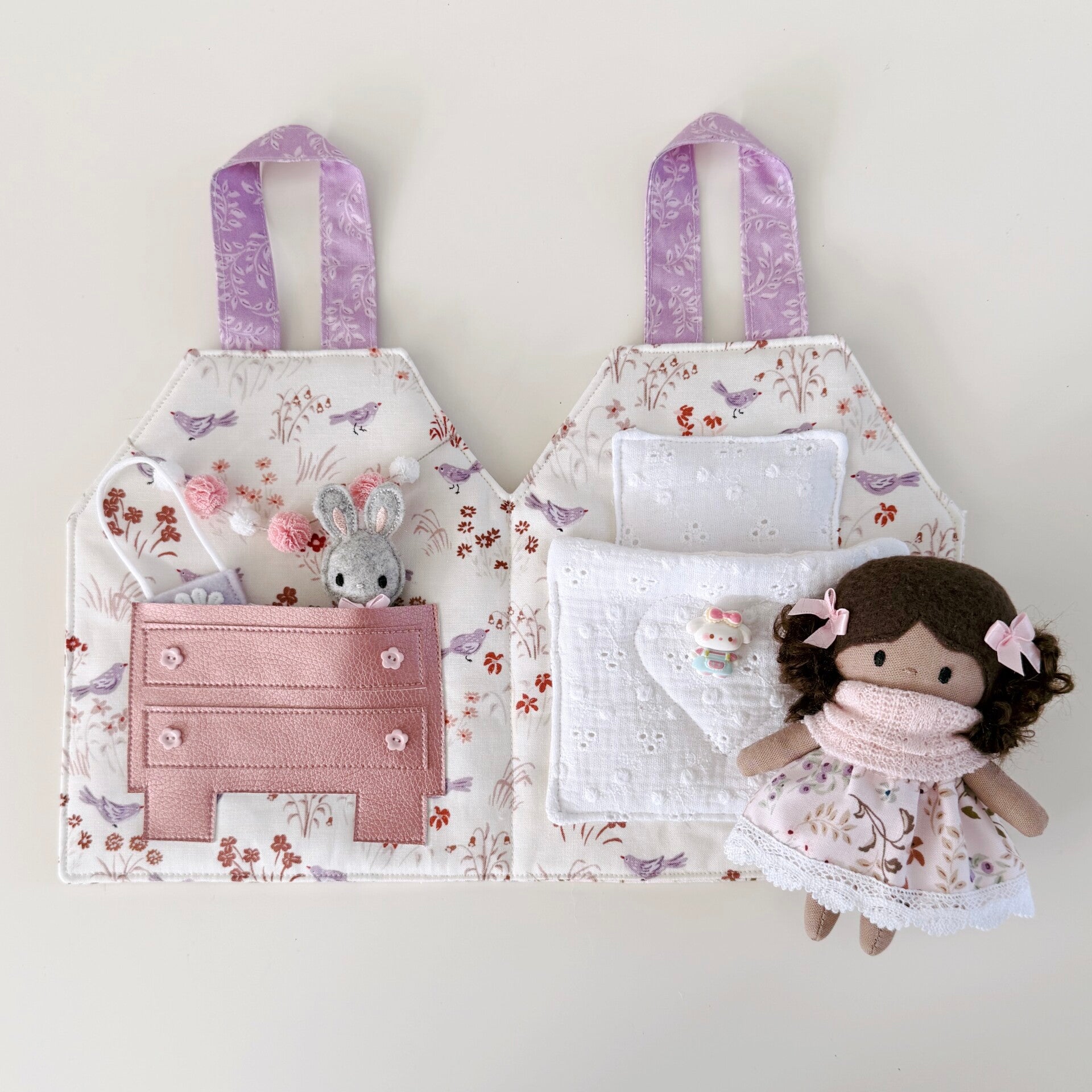 Hoe schattig is dit lieve draagtasje en huisje in één? Jouw Kleine Lievelijne popje van 12,5cm past er precies in! Het huisje kan worden opengemaakt dmv een knoopje en elastiek. Binnenin is het heel gezellig! Aan de linkerkant een kastje met daarin een bijpassend rokje, tasje en speelgoeddiertje. Aan de rechterkant een heerlijk bed waarin jouw popje lekker kan slapen. Een lief, zacht huisje om heerlijk mee te spelen. En ben je uitgespeeld? Dan vouw je het huisje weer dicht en aan de hengsels neem je het overal mee naartoe.